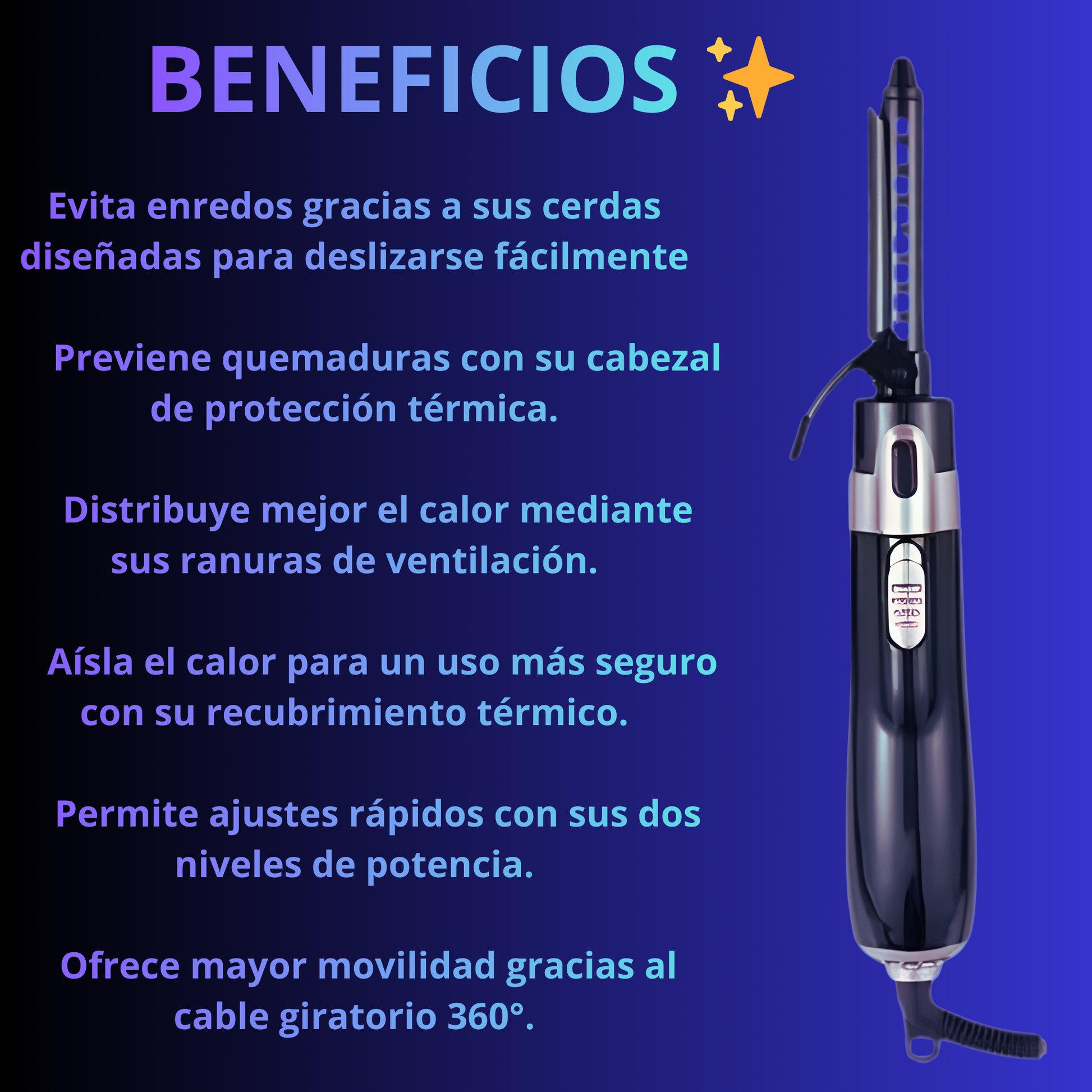 - ✨ Secado y estilizado rápido mientras protege tu cabello, gracias a la distribución uniforme de calor que mantiene su hidratación natural y reduce el daño, logrando resultados suaves y brillantes en menos tiempo.